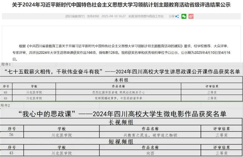 近日,省委教育工委、省教育厅公布了2024年主题教育活动省级评选结果公示,共评大学生讲思政课获奖作品166项,微电影126项。川北医学院选送作品获省级三等奖4项。