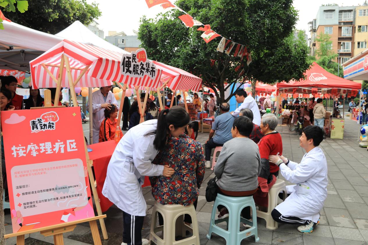 在五四青年节来临之际,4月29日下午,成都高新区合作街道顺江社区小广场前人潮涌动,“青聚动能·青公益便民服务集市”志愿活动在此火热开展。来自成都光华技工学校的青年志愿者携手社区商户青年志愿者,为居民提供健康义诊、智慧助老、急救培训等多元化服务。这场活动既将便利送到居民“家门口”,更成为高校青年志愿者深度融入社区治理的生动实践。