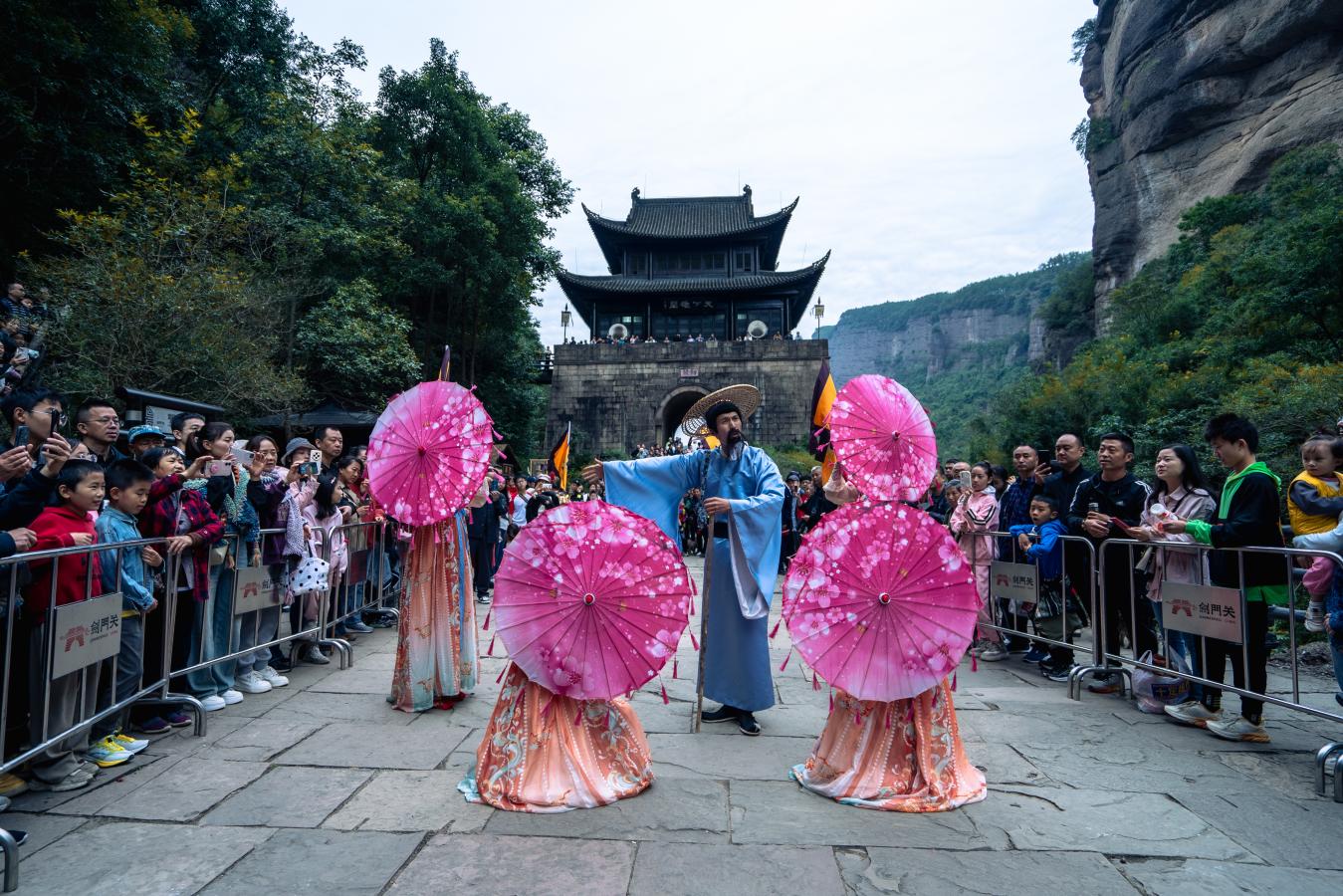 5月2日上午,在剑门关景区北门广场处,一群身着传统服饰的鼓手,以矫健的身姿击打出铿锵有力的节奏,腾跃的身姿与险峻的山势相得益彰,翻飞的红绸在苍翠山色中划出绚丽的轨迹。“黄土高原的奔放豪情与蜀道文化的厚重在这里完美融合,这种文化碰撞真让人心潮澎湃。”来自河南的摄影爱好者王先生感叹道。