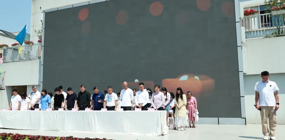 随着防空警报的鸣响,全体师生低头肃立3分钟,为地震遇难者们沉痛默哀。
