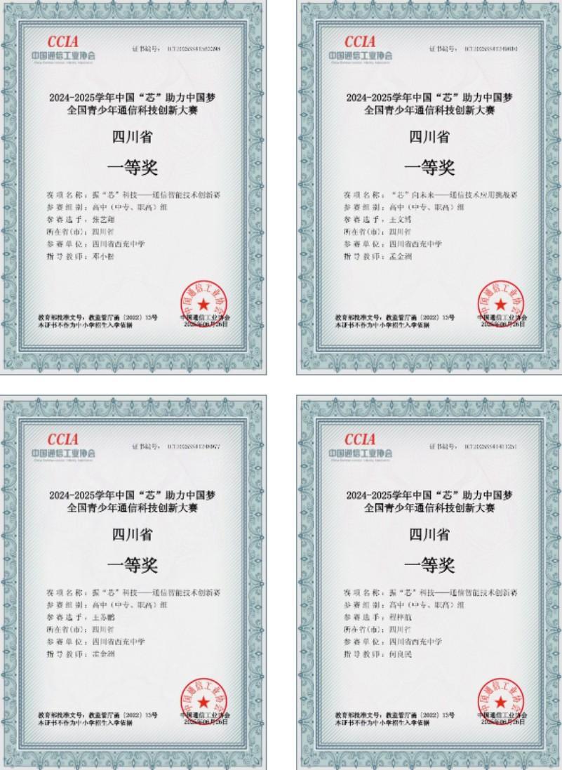 四川南充西充中学高2024级学子在2024-2025学年“中国芯”助力中国梦——第三届全国青少年通信科技创新大赛四川省赛中,勇创佳绩。5月17日,这场汇聚全省 1.7万中小学生的科创大会在成都嘉祥外国语高级中学展开激烈角逐,西充中学学子首次参赛即斩获省一等奖5项(晋级8月大连全国总决赛)、省二等奖4项、省三等奖3项,邓小松、孟金洲、何良民等指导教师获“优秀指导奖”!