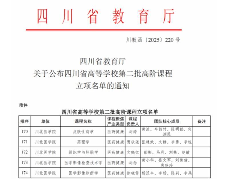 近日,四川省教育厅发布《四川省教育厅关于公布四川省高等学校第二批高阶课程立项名单的通知》(川教函〔2025〕220号),川北医学院临床医学院·附属医院《皮肤性病学》、药学院《药理学》、基础医学与法医学院《组织学与胚胎学》、医学影像学院《医学影像检查技术学》《医学影像诊断学》5门课程立项四川省高等学校第二批高阶课程。