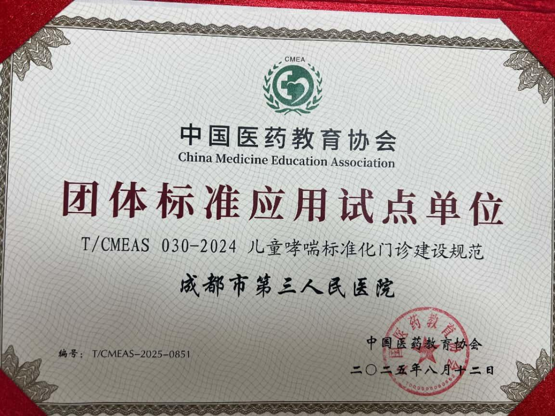 2025年9月6日,由中国医药教育协会主办的“儿童哮喘标准化门诊建设规范团体标准应用试点单位授牌仪式”在汕头市召开。成都市第三人民医院儿科作为获准挂牌单位现场接受授牌。