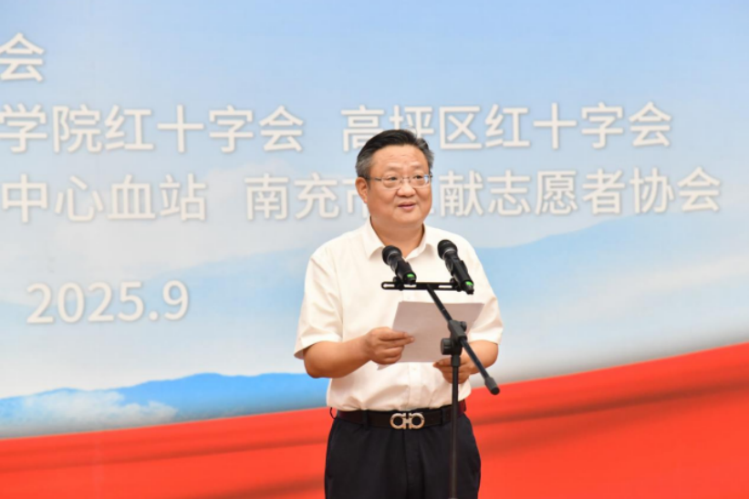 黎明代表学校向各位领导、专家和来宾的到来表示热烈欢迎,向广大无私奉献的志愿者们致以最崇高的敬意。他指出,作为立德树人的主阵地与社会文明的辐射源,学校始终将志愿服务作为生命教育的实践课堂,创新推动红十字工作与学校专业建设深度融合,学校依托各专业优势组建了“天使护航”志愿服务队、“青芒微光团”等多支特色志愿队伍,构建了“教学—培训—实践—服务”四位一体的红十字工作体系。学校师生深入社区、中小学和乡镇基层,广泛开展健康科普、应急救护培训等志愿服务,打造具有专业特色的实践品牌。目前,南充职业技术学院注册志愿者已达29266名,参与志愿服务师生达3012人次,累计献血总量达63.2万毫升,开展应急救护培训86场,覆盖师生11450余人次,获红十字救护员认证3350人。学校先后荣获“四川省青年志愿服务优秀组织”“南充市年度优秀志愿者团队”“南充市十佳无偿献血先进服务集体”等荣誉称号。他呼吁“南职”师生不仅要做生命安全的坚实守护者、文明风尚的积极引领者,更要成为时代精神的鲜活诠释者,在服务社会、奉献人民的实践中绽放青春风采,为全面推进健康中国建设注入澎湃的青春动力。