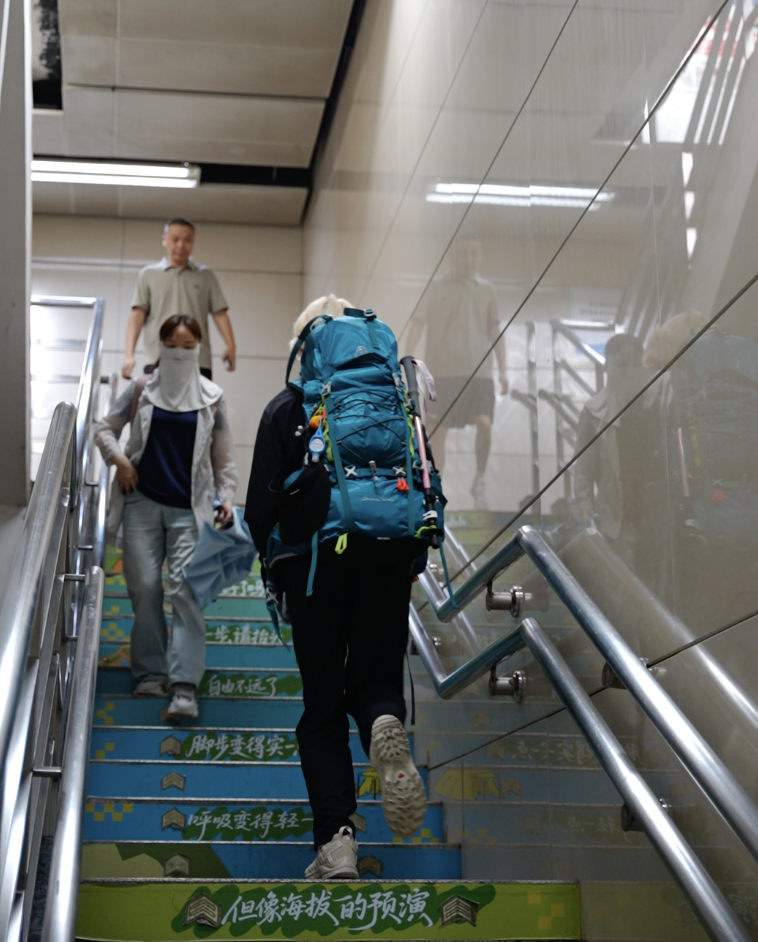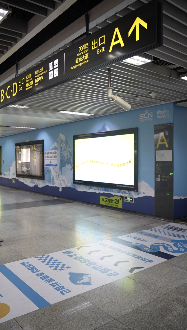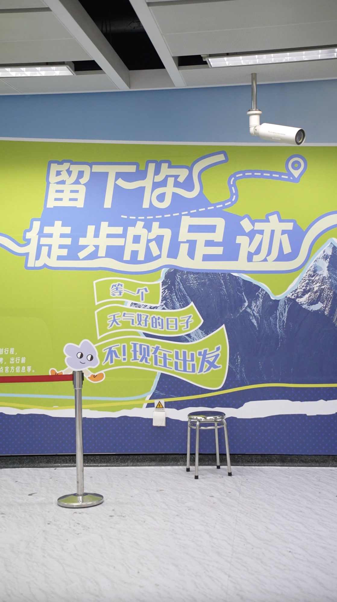 “山高路远,看世界,找自己”“带上你的雪山搭子,出发!”彩绘墙上,充满力量的标语将天河路地铁站变为充满仪式感的户外旅行“出征”地。