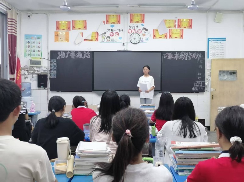 二是围绕“加大国家通用语言文字推广力度,促进铸牢中华民族共同体意识” 主题,学校召开了全体教师会,对各项活动做了周密的部署,学校分管教学副校长高莉在9月12日下午全体教师会上对第28届推普宣传工作进行了动员,教务处主任钟玉平对各班开展活动进行了详细布置,并提出了具体要求,每一项活动都落实了具体内容和负责人,要求教师人人上课使用普通话。