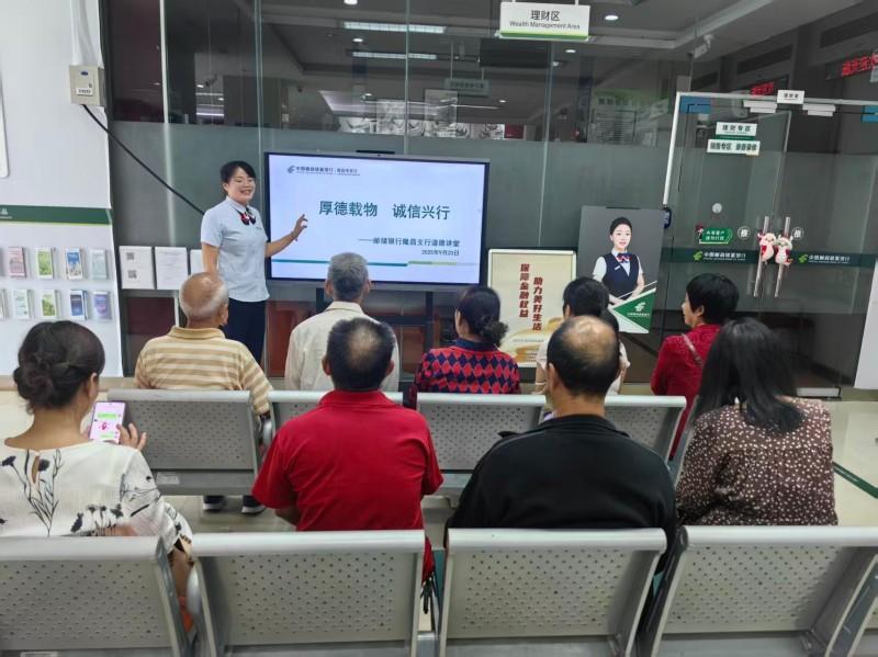 为加强诚信文化建设,提升客户的信用意识,邮储银行隆昌市支行于2025年9月20日公民道德宣传日当天在厅堂成功举办了以“厚德载物,诚信兴行”为主题的道德讲堂活动。