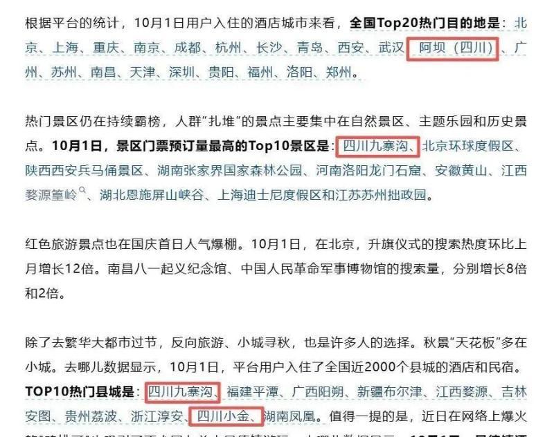 根据去哪儿平台数据显示,阿坝州上榜全国TOP20热门目的地,九寨沟成为门票预订量全国TOP10景区第一名,九寨沟县、小金县成为全国TOP10热门县城。
