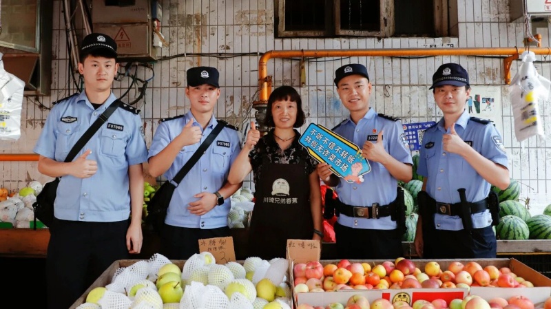 离川中大市场不远的蜀绣东街潮汐市场,是另一番鲜活景象——周边农民带着自家种的乡土菜、土鸡蛋赶来,这里日出而聚、日午而散,交易模式传统,不少老人习惯使用现金支付,也因此成了扒窃案件的高发地。“大爷,要是见到可疑人员,不用跟他们正面冲突,记清特征告诉我们就行!”“大妈,手机录像功能很简单,我教您怎么用,遇到情况能及时留证据!”9月13日,民警汪帆的耐心劝导,让群众养成“主动报”的好习惯,一张“公安+群众”共同参与的防护网就此织成,实现了潮汐市场扒窃案件零发案。