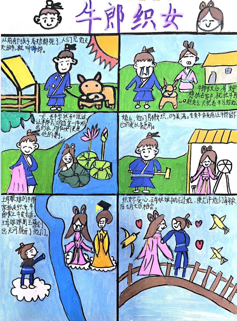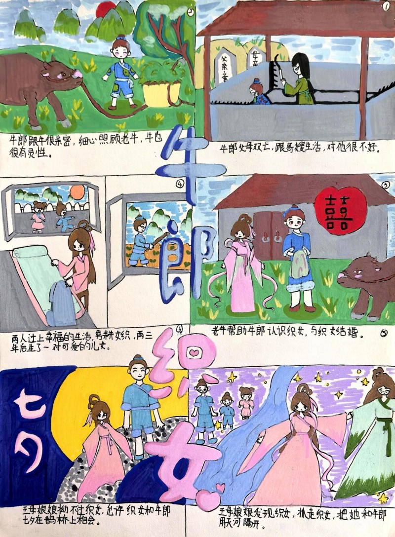 翻开语文书第三单元,那些耳熟能详的民间故事在五年级八班同学们的笔下焕发出新的生命力。以《牛郎织女》为基础,采用小组合作完成的方式,孩子们用稚嫩却用心的画笔,将文字转化为一幅幅生动的画面。