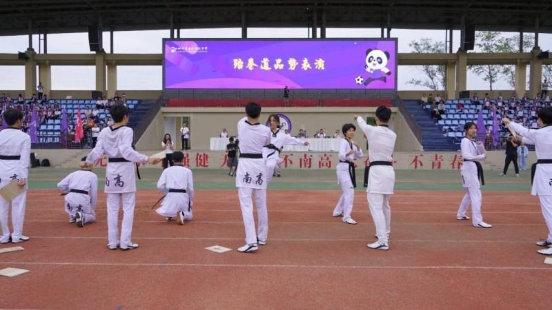南充高中跆拳道队带来精彩的跆拳道品势表演,用敢打敢拼、永不言弃的体育精神感染全体足球队员,为他们加油助威。