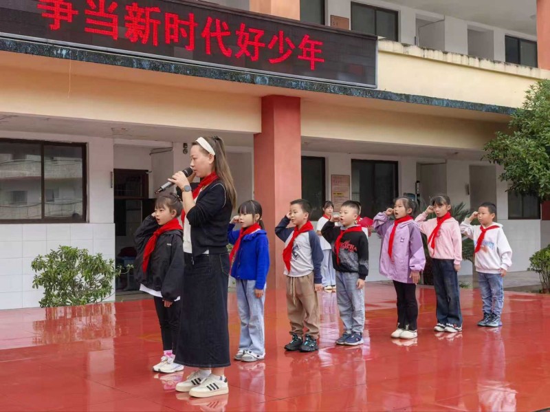 随着激昂的出旗曲奏响,少先队旗手迈着坚定有力的步伐,高举队旗缓缓入场。鲜红的队旗在阳光下熠熠生辉,象征着革命先辈的热血与信念;在场师生全体肃立,目光追随着队旗,心中涌动着对少先队组织的崇敬与向往。紧接着,全场奏唱队歌。当熟悉的《中国少年先锋队队歌》旋律响起,全体队员齐声高唱。