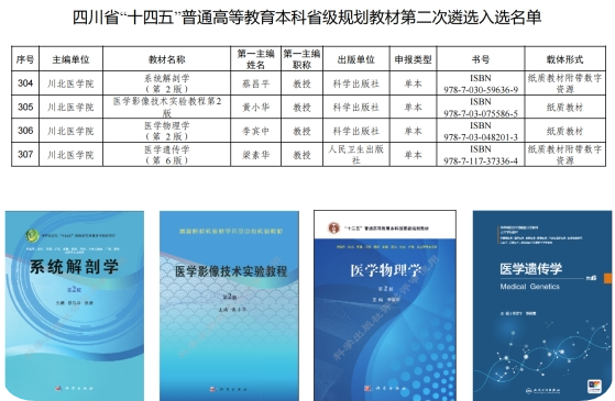 近日,四川省教育厅公示了“十四五”时期普通高等教育本科省级规划教材第二批遴选入选名单,川北医学院共有4部教材成功入选。