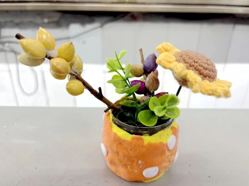 光溜溜的果核在孩子们手里“活”了起来!磨、刻、穿、捏、拼、画……孩子们使出十八般武艺,将果核变成了手链、摆件、贴画、盆栽等,每一件都藏着孩子们闪闪发亮的创意!