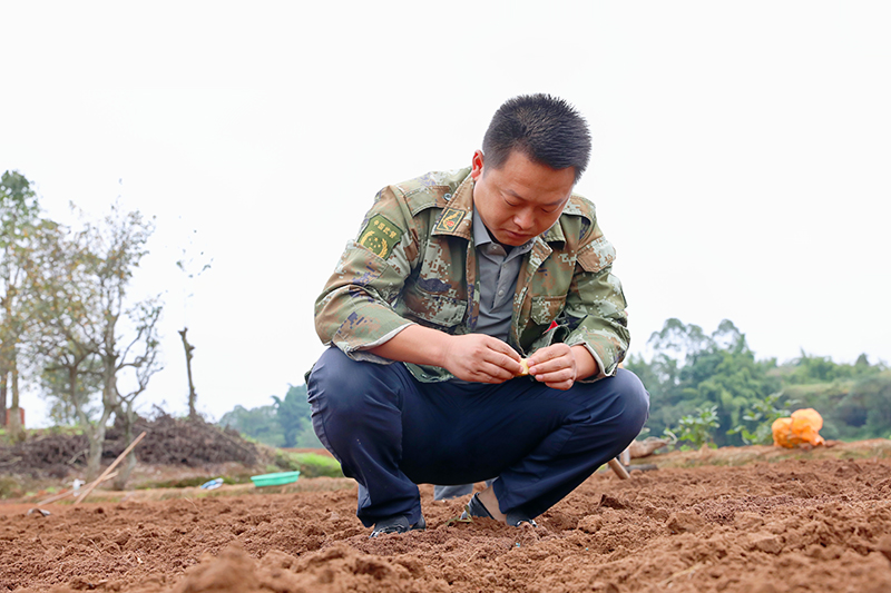 十月的自贡市贡井区五宝镇,风里带着泥土翻新的气息。照石村的田垄间,丁本杰蹲下身,抓起一把潮润的土,在掌心捻了捻。墒情正好,他直起身,对田里劳作的乡亲们喊道:“大家加把劲,这几天就把种薯都安顿好!”话音落下,他又深一脚浅一脚地踩进松软的土里,接过一位老乡的锄头,熟练地开沟、点种、覆土,一边做一边讲解:“株距二十公分,芽眼朝上,这深度就得刚好……”此时的丁本杰,更像一位田间把式,很难看出他曾在西藏高原戍边五载,是个不折不扣的“老兵”。