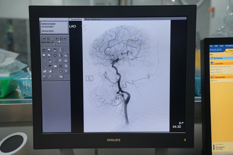 本次脑血管造影术对象为一名57岁女性患者,因既往动脉瘤术后复查需行脑血管造影术入院。在PANVIS-A®脑血管介入手术机器人辅助下,手术团队精准完成双侧颈总动脉及左椎动脉超选造影,并实施三维血管重建。手术在医院副院长曾春主任医师指导下,由脑血管疾病科副主任段佳主刀,团队配合默契,整个手术过程仅用时30分钟。术后造影显示动脉瘤栓塞效果良好,各分支血管显影清晰,患者术后状态平稳,未出现并发症。