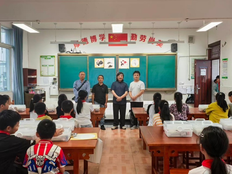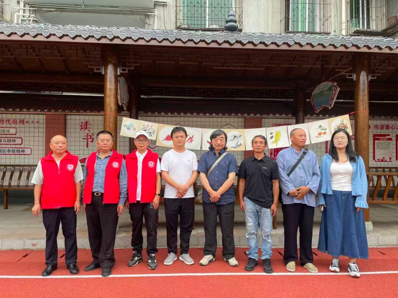 活动伊始,林栩及其弟子与学校校长梁文彬及为社团赠送学习用具的峨眉山市关工委委员们一同参观校园文化长廊。大家仔细浏览长廊内学生创作的绘画作品,不仅肯定了学生们的艺术表现力,更指出“少年儿童的创作是文化传承的鲜活表达”。这一过程既让学生感受到自身创作的文化价值,也初步激活其“发现美、理解美”的审美感知素养,为后续接触指画艺术搭建文化共鸣基础。随后,林栩一行人前往社团课专用教室,与学校美术教师协作合力,有序准备、分发学习用具,为课程开展做好准备。