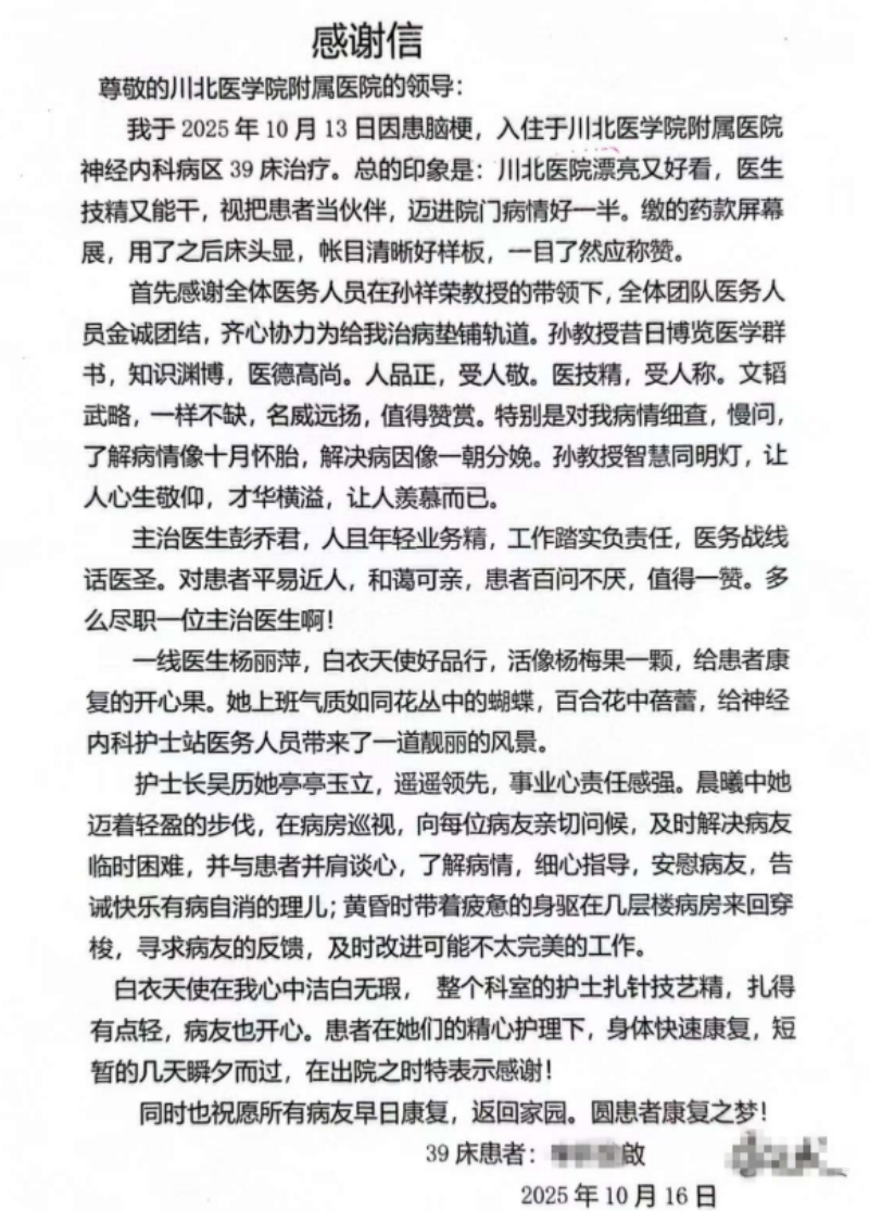 这封感人至深的表扬信,是患者“从迷茫到心安”的心路注脚,更是医院“以患者为中心”理念的生动实践。川北医学院附属医院神经内科始终以“破解疑难杂症”为使命,以“人文关怀”为底色,在医疗技术与服务温度的双向奔赴中,为患者筑起康复港湾。(供稿方:川北医学院附属医院 彭乔军 孙祥荣 吴历)