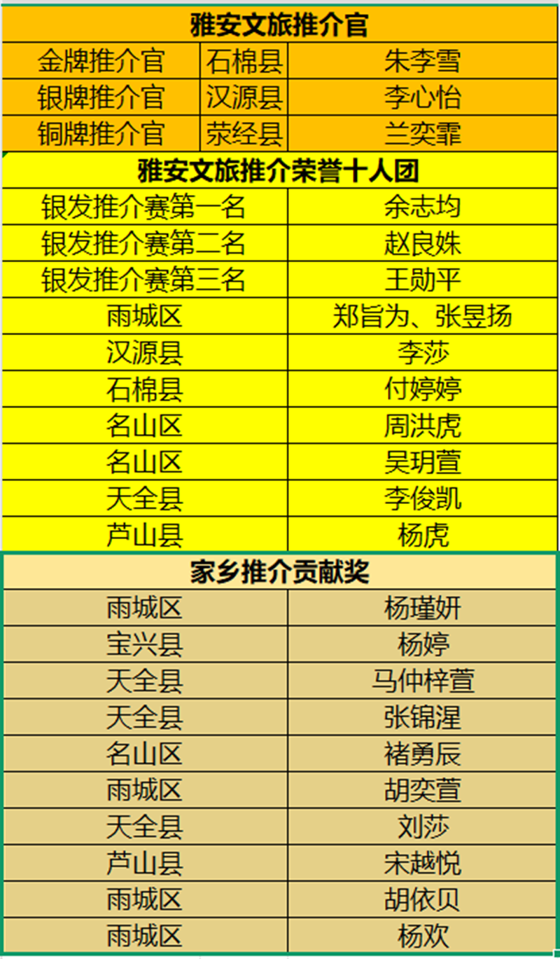 经过专业评审、大众评审及线上投票的综合评定,大赛最终评选出金、银、铜牌雅安文旅推介官,以及“雅安文旅推介荣誉十人团”、“家乡推介贡献奖”、线上新媒体创作大赛各单项奖和“优秀组织奖”等一系列荣誉。