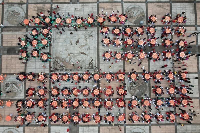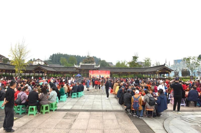 中午时分,在景区八仙广场,摆放容纳千余人座位的圆桌,更是增添了节日气氛。大家齐聚一堂,一边观看着川剧变脸、美猴王、小魔术等本地民俗节目,一边吃着坝坝宴,品尝舌尖上的美味,共话美好未来。