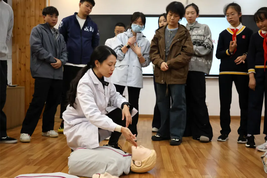 活动中,成都市第三人民医院儿科团队用专业教具,生动形象地讲解了心肺复苏的操作要点、海姆立克急救法的适用场景。为让大家更好地掌握技能,特别设置分组实操环节。在医护人员的指导下,师生们轮流在模拟人上进行心肺复苏练习,学习如何正确处理气道异物梗阻等紧急情况。