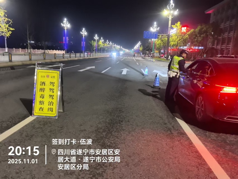 为进一步强化道路交通安全源头管理,有效遏制涉酒、涉醉驾驶引发的道路交通事故,切实保障人民群众生命财产安全与辖区道路交通秩序稳定,10月31日-11月2日晚,四川遂宁公安交管支队持续开展夜查酒醉驾专项整治行动,始终保持对酒醉驾等严重交通违法行为的严查严处高压态势。