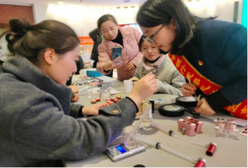 再次来到的是第三个“指尖匠心·芳华绽放”板块。为了丰富社区妇女的文化生活,活动现场还开展了口红DIY活动与手工皂制作,这是一次充满创意与乐趣的体验,更是一次初心与匠心的对话。在口红DIY环节,社区提供了“初心红”“赤诚金”“巾帼粉”等特色色号,寓意“党徽映初心,红心永向党”。同时,在手工皂制作区域,大家也可以发挥创意,制作出属于自己的手工皂,感受传统手工艺的魅力。活动将艺术创作与社区文化相结合,展现新时代女性的智慧与活力。
