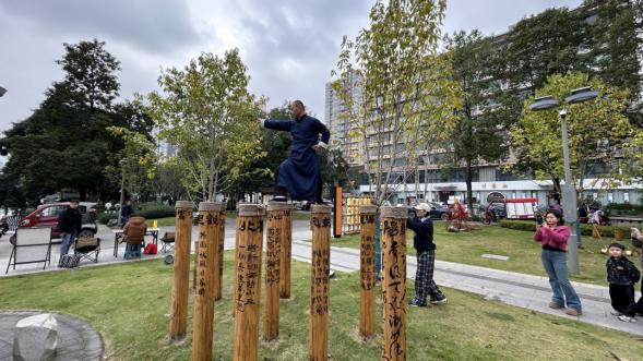 在茶馆的一旁,海灯武术非遗传承人张果成轻松一跃,踏上了梅花桩,一套“梅花桩精拳”行云流水,引得周边居民纷纷拍手叫好。梅花桩旁,一把2米长壶嘴的铜壶静静摆放,一位茶客好奇地伸手触碰,再掂了掂铜壶的重量……张果成丝毫没有阻止,反而微笑着给居民介绍着这门技艺。