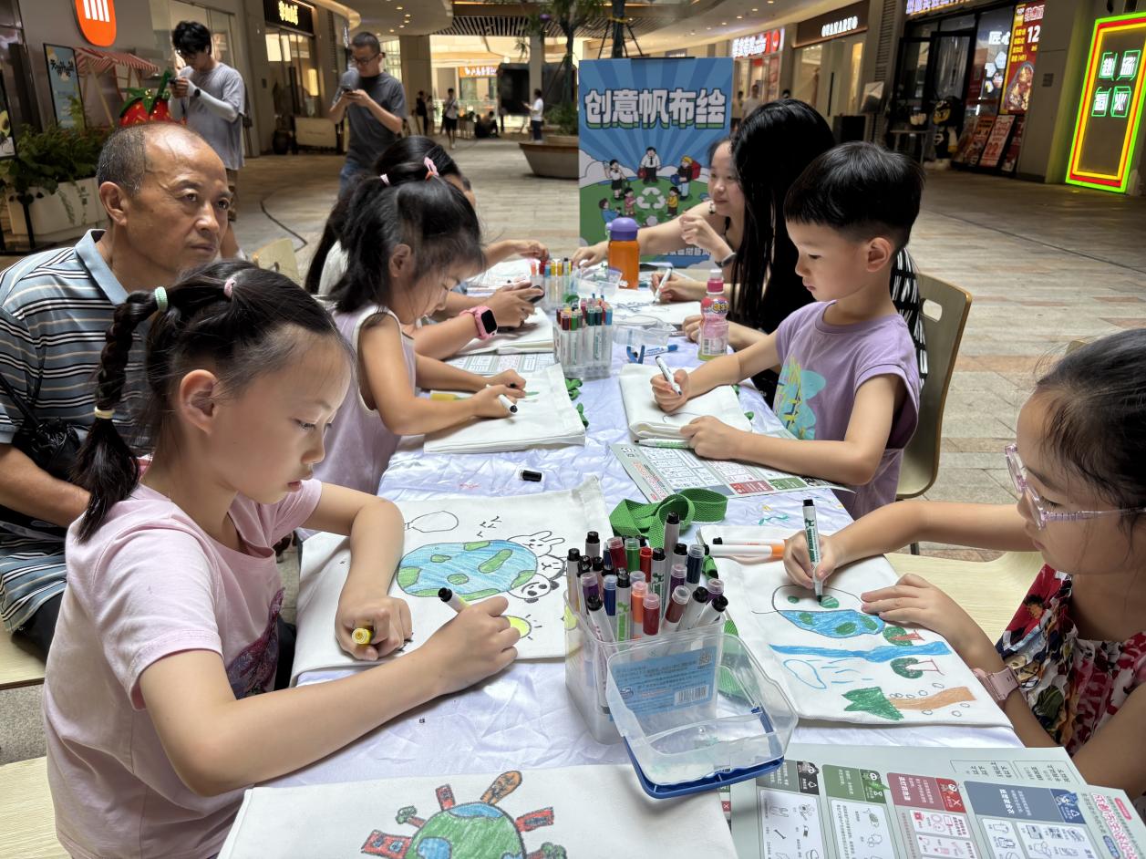 活动还设置创意帆布绘画区,为参与者提供空白帆布袋、环保马克笔。居民围绕“世运会”“绿色地球”“垃圾分类”等主题自由创作:孩子们用稚嫩的笔触画下创意地球、干裂与环保地面;年轻群体则将熊猫与低碳符号结合,展现青春活力与环保担当。