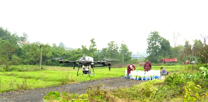 当前正值秋播小麦的备耕关键期,前锋区观阁镇珠石村的田间地头一派繁忙景象,一架大型无人机正低空盘旋,精准完成施肥作业。田埂旁,工人正麻利地拆解复合肥料包装,待无人机返航后迅速补给,确保作业高效衔接。