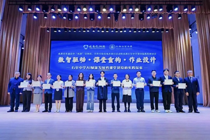 下午的议程在成都市教育科学研究院领导的致辞中继续推进。活动现场举行了简朴而庄重的献课教师证书颁发仪式。在随后的交流分享环节,石室中学党委副书记、校长刘涛系统介绍了石室中学在作业设计方面的实践与探索;成都市第七中学副校长赵敏也围绕“AI赋能教学”展开阐述,结合案例分享了智慧教育的前沿理念与校本实践。