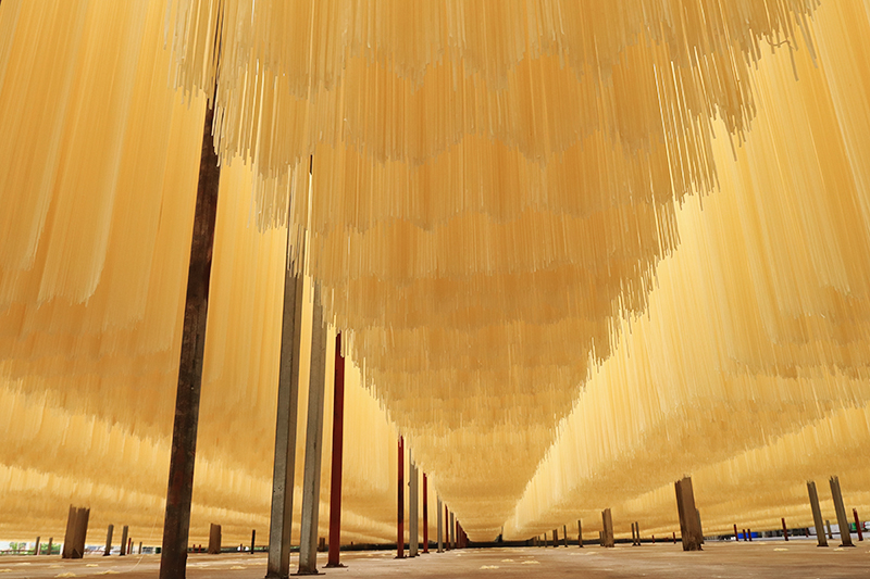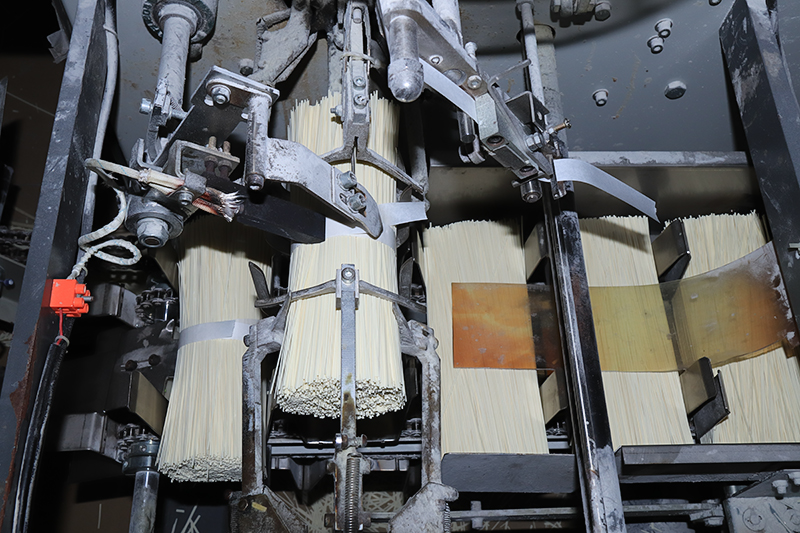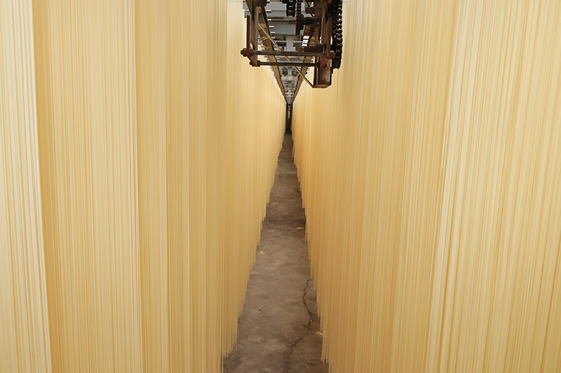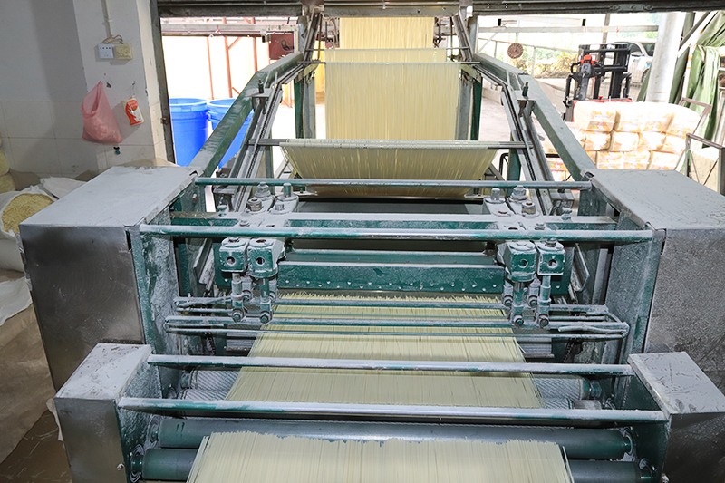 如今,惠玲面条生产已基本实现机械化,涵盖和面、熟化、压面、大切面、晾晒烘干、小切面到包装的全流程。在宽阔院坝里,一排排1.56米长的面条整齐悬挂,随机械缓缓移动。夏日靠自然风干燥,深秋则启用专业风机均匀送风,再通过烘干设备平稳蒸发内部水分,确保口感稳定。