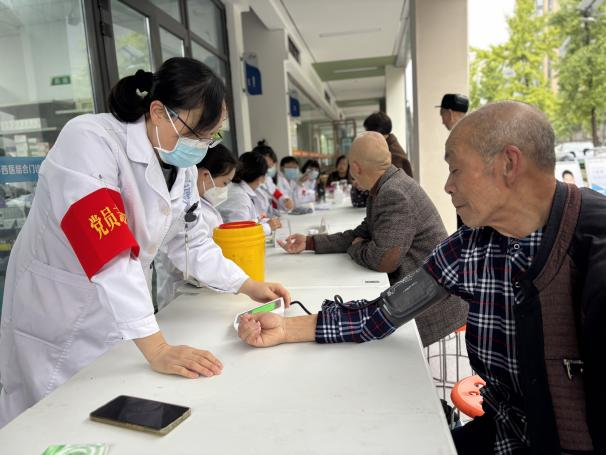 党员医护人员现场为群众测血压、血糖,并积极开展健康宣传,提升群众的保健意识和能力。
