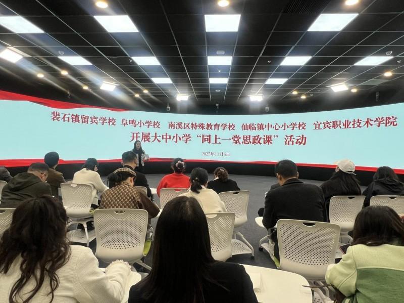 为深化大中小学思政课一体化建设,扎实推进立德树人根本任务落地见效,2025年11月6日下午,宜宾市南溪区阜鸣小学校、仙临镇中心小学校、裴石镇留宾学校及区特殊教育学校,组织50名管理干部、思政课教师、班主任与党员教师代表,共同前往宜宾职业技术学院,联合开展“同上一堂思政课”暨主题党日活动,以沉浸式研学夯实思想根基,以校地协同探索思政育人新路径。