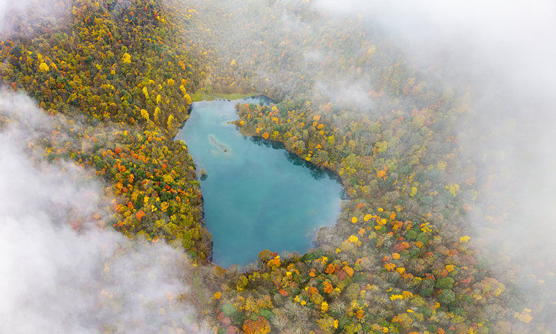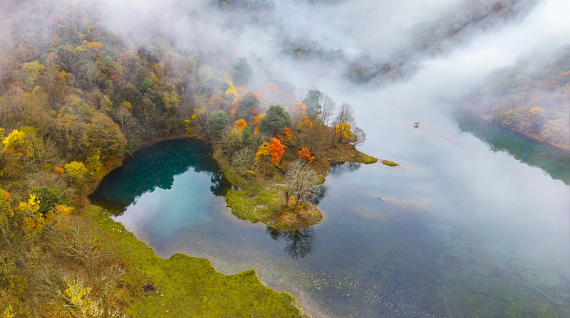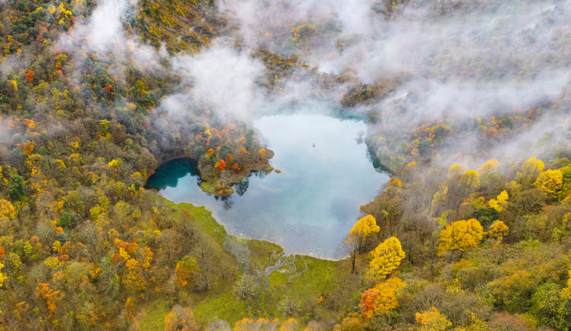 11月11日,已经是初冬时节,在四川石棉县的大山深处,总带着漫山遍野不肯褪去的秋意。特别是栗子坪彝族乡,拖乌山如一道苍茫的脊梁,横亘于天地之间。而在这山坳的怀抱中,月亮湖宛如一块被遗落人间的翡翠,静静镶嵌于五彩斑斓的彩林之间。
