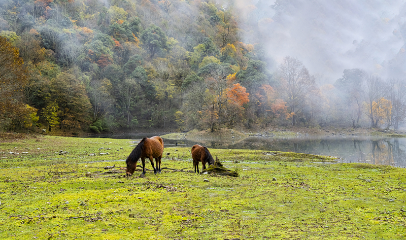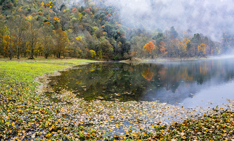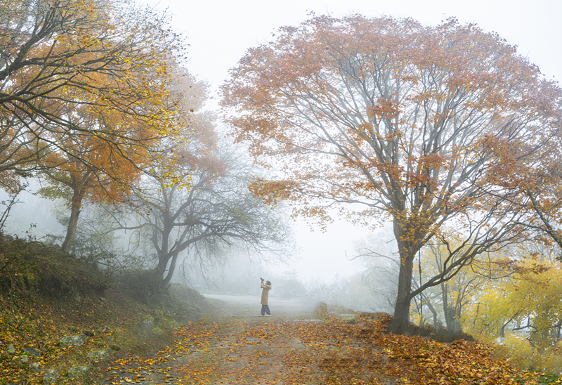 在这如诗如画的景致中,人仿佛也变得宁静平和起来。心,不再被世俗的喧嚣所扰,不再被生活的琐事所困,只剩下眼前的美景和内心的宁静。站在山间,任由微风拂面,任由薄雾飘散,任由那美景一点点浸润心田。落叶像彩蝶一般,在空中起舞,然后轻轻地落在湖面,落在地上,落在每一个过客的肩头。它们用最温柔的方式,与秋日告别,去拥抱大地,拥抱冬天。这种秋冬难分的光景,令人沉醉其中,无法自拔。