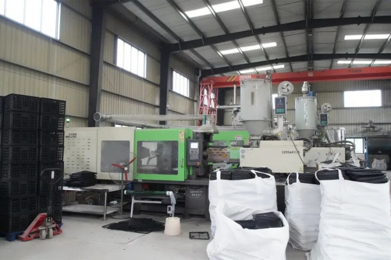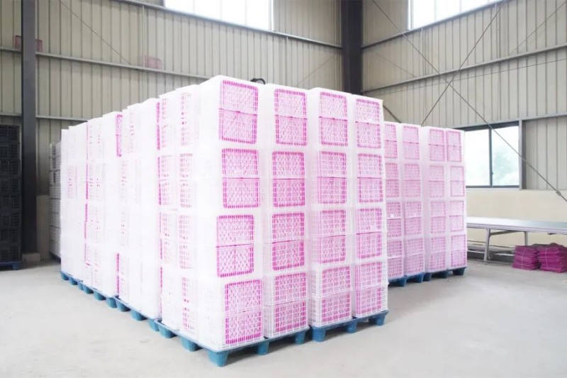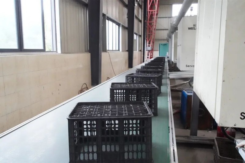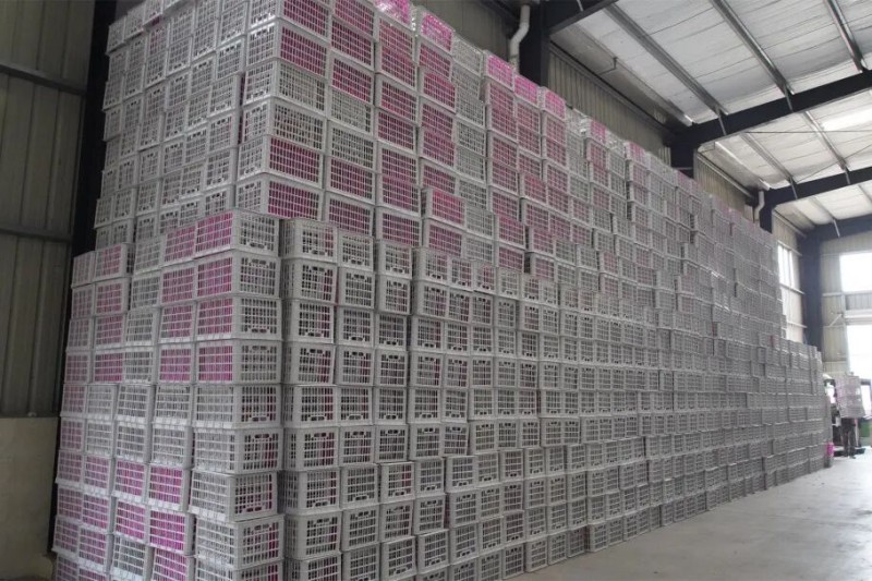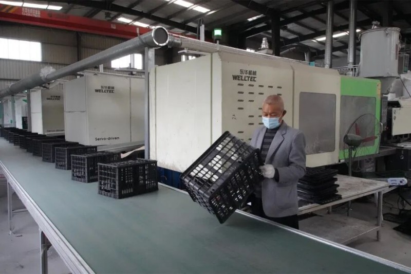 在集益镇沃然农业综合服务中心内,全自动吹塑机将滚烫的塑料颗粒挤压成标准化果框,机械臂精准抓取成品,传送带载着果框有序入库。
