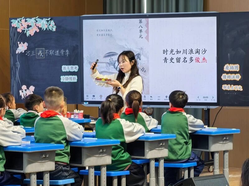 在第三组比赛中,来自福禄小学的唐源老师通过诵读理解、合作探究、角色扮演等多元化方式,引导学生掌握文言学习方法,并学会在生活中辨别真伪,不盲目跟从。凤凰学校喻晓容老师采用“读—悟—讲”层层推进的教学策略,引导学生在诵读中感受文言韵律,在思辨中体会严谨逻辑,在讲述中内化王戎勤于思考的品质,于潜移默化中滋养了学生心灵。踏水小学张智老师巧妙地将课堂打造成“古代朝堂”,学生化身“小小史官”,需向“魏王”清晰汇报事件,在角色体验中锻炼了学生的逻辑思维与表达能力。