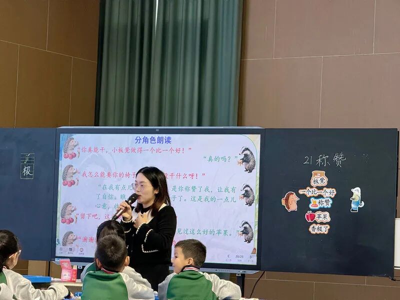 随后,嘉农镇中心小学徐梦媛老师从学生的生活经验切入,自然引导大家解读“称赞”的深层含意。孩子们通过勾画关键语句、积极参与分角色朗读,在沉浸式体验中探寻真诚赞美的方法。