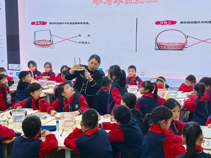 沙湾小学张祎老师执教的《果篮传情谊》,设计了认识果篮材质、形状、结构、编织纹理,用线条画编织纹理,由浅入深地了解果篮,为使用水墨技法画果篮作铺垫。为解决难点,示范的部分录制了各种篮子的画法供学生观看,为他们创作时怎样画,如何画起到了引导作用。