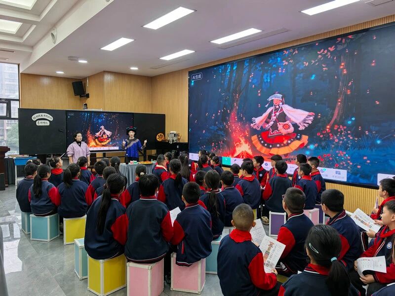 踏水小学阿罗罗鑫老师与音乐老师李想携手打造了40分钟双师课堂,以《彝族纹样文创设计》与《阿细跳月》为课题,为学生开启沉浸式彝族文化探索之旅。从“温故知新”环节速答民族色彩与纹样寓意,到“赏纹之意”解析适合纹样与对称法则,再到“品韵之音”感受《阿细跳月》的五拍子韵律与切分节奏,双师层层递进,实现美术与音乐的跨学科融合,为中小学跨学科民族文化教学提供了优质范例。