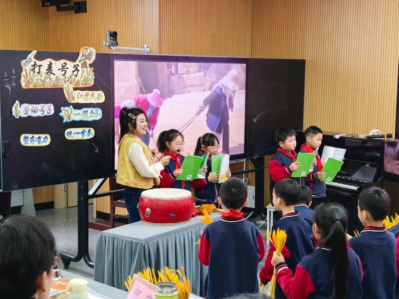 葫芦小学袁媛老师执教的江苏民歌《打麦号子》,通过视频导入与抬桌子喊口号的互动体验,让学生直观感受劳动号子的特点。新课环节,学生通过多次聆听、学唱呐喊与旋律部分,掌握了“一领众和”的演唱形式及歌曲中的下滑音、变拍子等技巧。活动尾声,学生分组进行场景创编,结合打麦动作与鼓乐伴奏,再现丰收场景,让孩子们切身感受到民歌与劳动生活紧密相关,加强了对劳动号子的理解,激发了对传统音乐文化的热爱与传承意识。