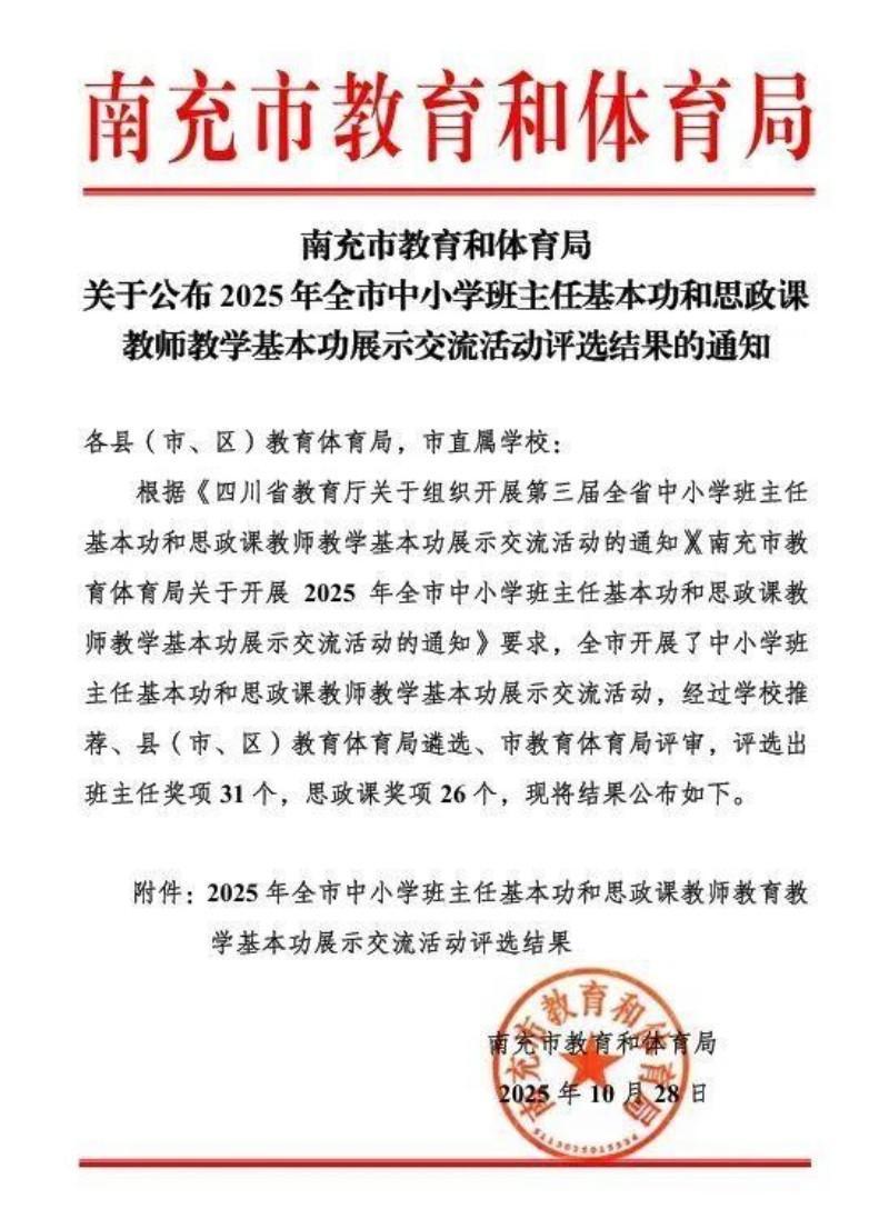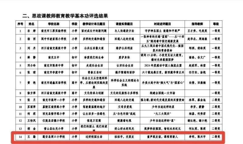 近日,南充市教育和体育局开展2025年全市中小学班主任基本功和思政课教师教学基本功展示交流活动,蓬安县周口小学校教师王勤获得二等奖。