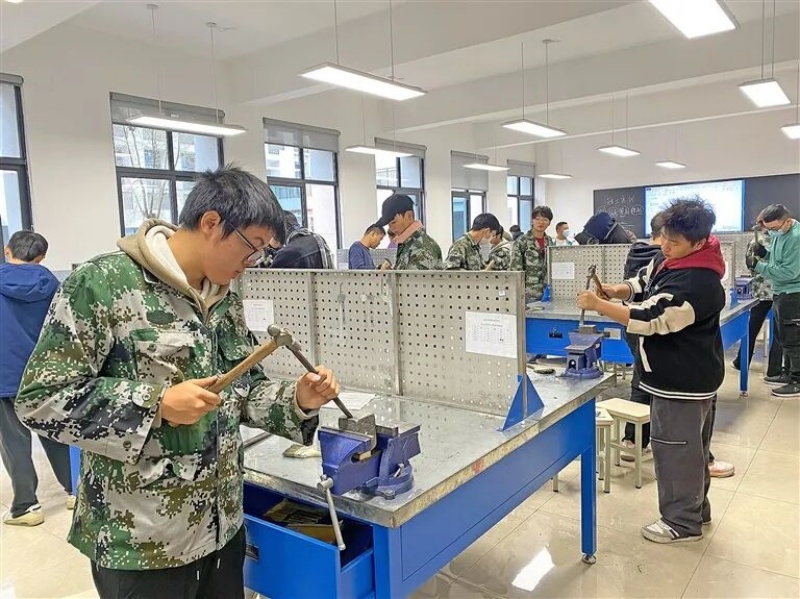 遂宁能源职业学院钳工实训室内,学生对板料进行錾削。杨柳摄