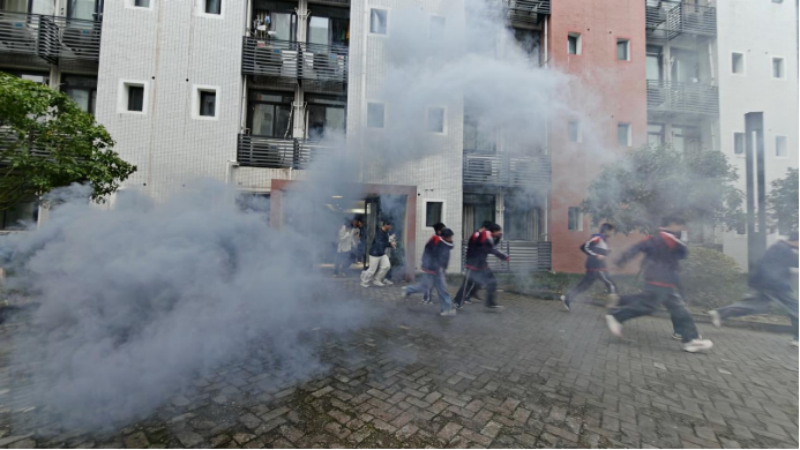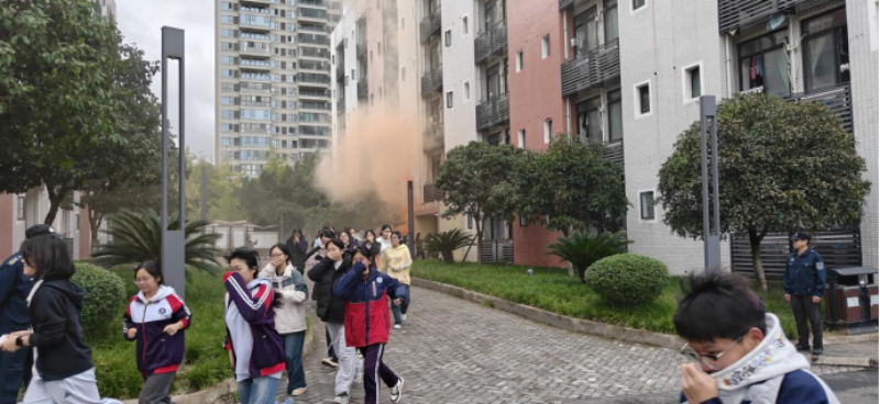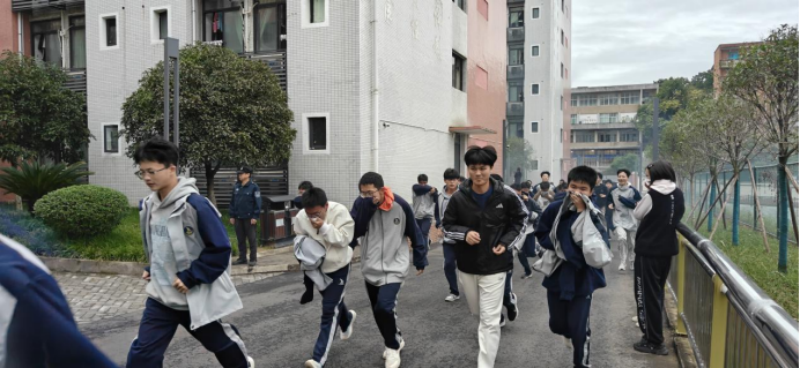 当日下午5点20分,演练正式启动。各宿舍楼同步触发消防警报,学校安全员立即通过广播下达撤离指令,并逐户提醒学生“捂鼻低姿、靠右有序”。在教官、生活老师与学生安全员的引导下,住宿学生迅速携带湿毛巾,弯腰贴墙沿指定疏散通道撤离。过程中,工作人员实时纠正“奔跑推挤、遗漏物品”等不规范行为,重点关注行动不便学生的撤离情况。用时3分钟,所有住宿学生均安全抵达运动场临时集结区,各班级立即开展人数清点,实现“全员撤离、无一遗漏”。