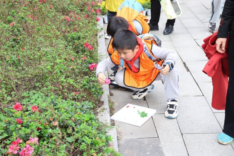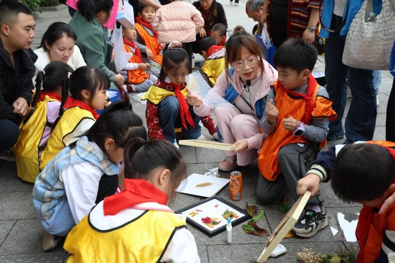 与此同时,象鼻街道大地社区推出“大地‘童’邻·亲子研学课堂”,组织家长与孩子走进翠屏山,在赏菊拾秋、追忆峥嵘岁月的同时,以动手实践定格秋日光景,为假期注入别样乐趣。其中,手工创作环节成为活动亮点,孩子们沿途收集落叶与花瓣,围绕秋日元素展开创意构思,家长从旁协助指导,共同拼贴出一幅幅鲜活的秋日图景。“我的手工作品用各种颜色的树叶拼贴而成,名字叫《四季》,每一种颜色都对应着不同季节的特点。”提及活动,学生田睿冉兴致勃勃地分享,言语间满是参与的快乐。亲子协作的默契、同伴互动的欢乐,让研学现场暖意融融。