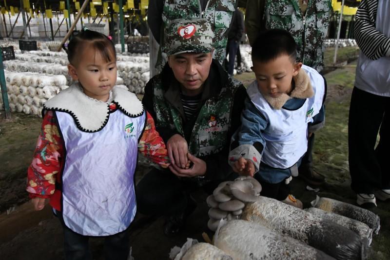在蘑菇工坊环节,老兵结合农业生产实例,向孩子们讲解玉米杆等农业废弃物如何转化为蘑菇菌包原料,生动诠释“变废为宝”的环保智慧,让节约与创新的种子在实践中萌芽。随后的生态轻徒步环节,老兵们化身“自然引导员”,陪伴孩子们沿乡间小路踏秋,还发起“环保小哪吒”行动,带领大家清理沿途杂草、落叶,让孩子们在分工协作中真切体会“劳动让环境变美”的价值。
