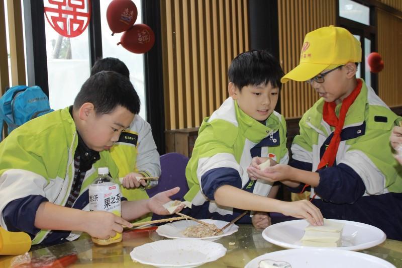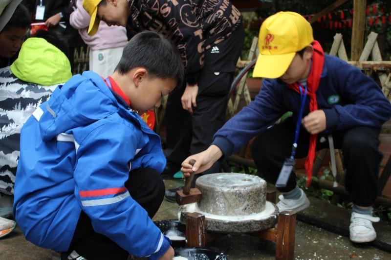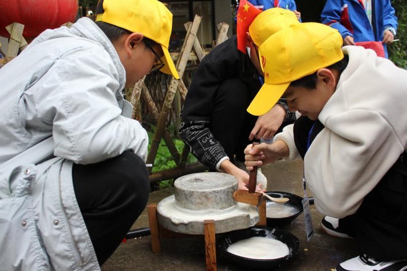 随后在手工磨坊区,孩子们没有停歇,立即将采摘的黄豆清洗、磨制。当乳白色的豆浆从石缝间渗出,他们真切地体会到“从田间到餐桌”的完整过程。许多孩子是第一次同时体验磨豆浆与包抄手,生涩的动作在团队协作中逐渐变得流畅。这场从理论到实践的沉浸式体验,让劳动教育不再是抽象的概念,而成了一个充满成就感的完整价值链条。