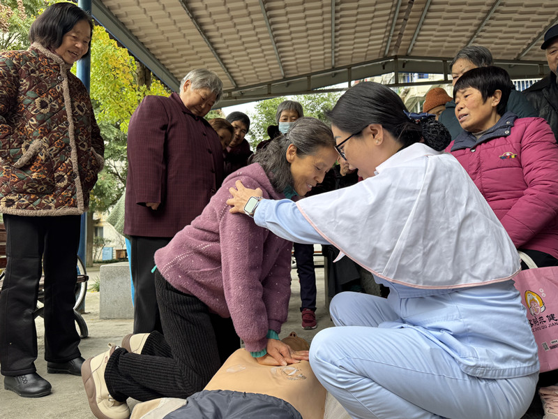 应急救护培训同样人气高涨。来自城北社区卫生服务中心的医生以通俗易懂的语言,系统讲解应急救护核心知识,重点围绕心肺复苏的操作要领、注意事项展开详细说明。为让居民真正掌握技能,医生现场进行实操演示,手把手指导居民规范摆放按压姿势、控制按压深度与频率。居民们学得格外认真,纷纷上前实操练习,在理论与实践的结合中,切实提升了应对突发情况的应急救护能力。