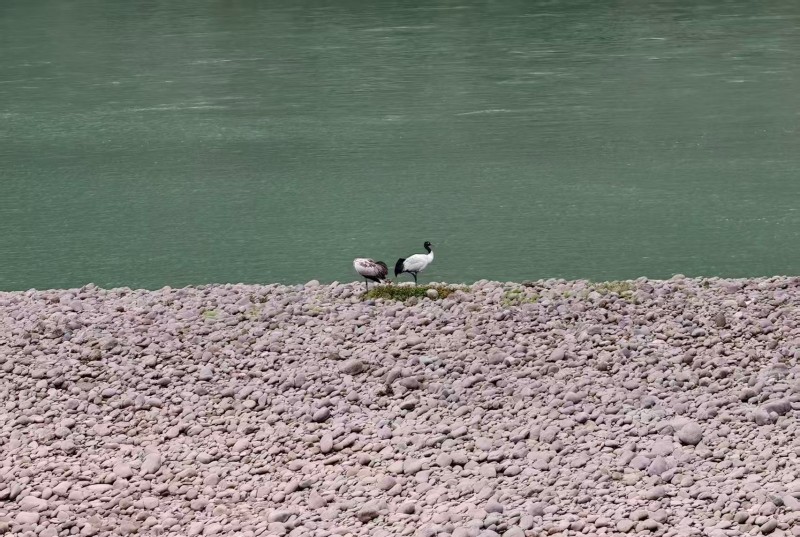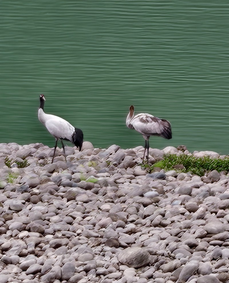 初冬时节,大渡河水碧绿如绸,两只黑颈鹤宛如优雅的仙子降临,它们身披黑白羽裳,舞步轻盈。时而低头觅食,时而舒展双翼,时而驻足凝望,与青山绿水共同构成一幅冬日人与自然和谐共生的灵动图景。吸引了路过此处的群众驻足围观,大家纷纷拿出手机拍照分享。